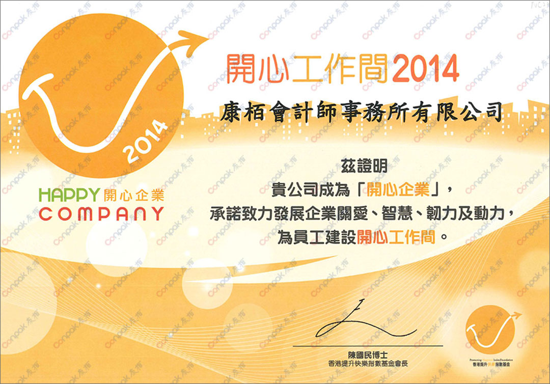 康栢在企業(yè)關(guān)愛、企業(yè)智慧、企業(yè)韌力及企業(yè)動(dòng)力方面表現(xiàn)優(yōu)異,于2014年6月13日獲頒“開心企業(yè)”標(biāo)志。